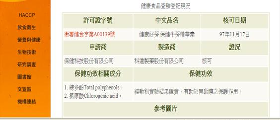 本研究團隊以牛蒡為素材開發出保健牛蒡精華素,通過國家健康食品認證(批准字號為衛署健食字 A00139 號)。